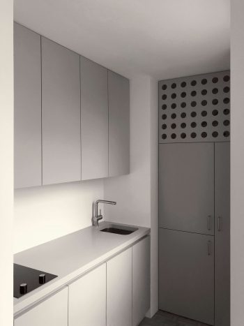 Entire kitchen for Micro Apartment is coated with several layers of thick epoxy paint to achieve clean and monolithic look.