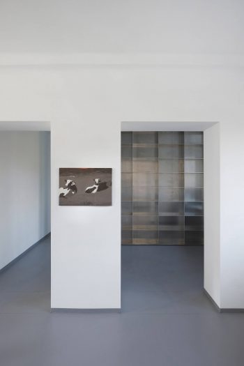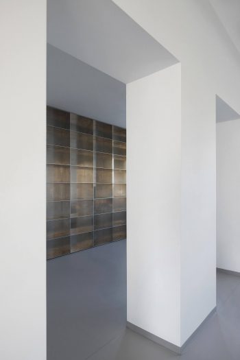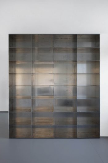 Knjižna omara je izdelan iz tankih plošč iz neobdelanega aluminija in deluje kot pregrada med dnevno sobo in kopalnico.