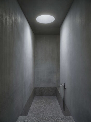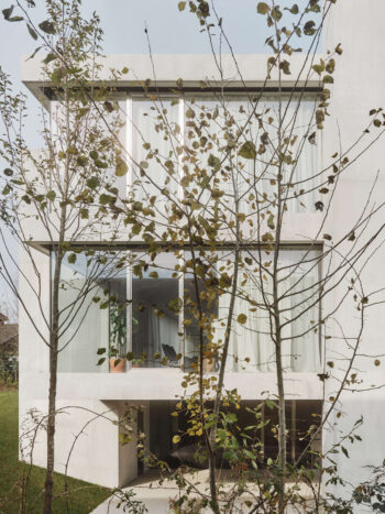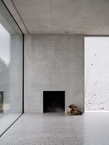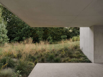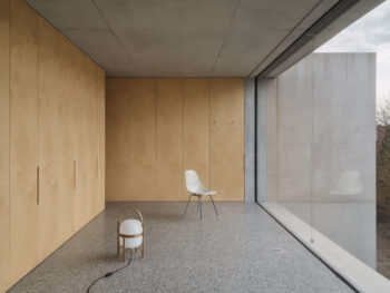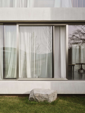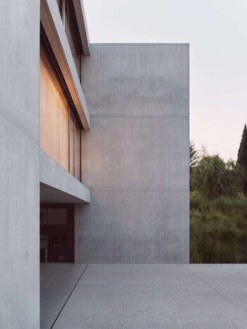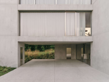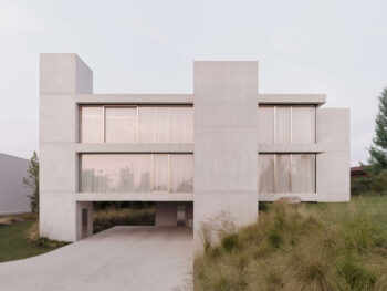 The house in Podutik is clearly divided into living and service areas. Service areas are situated inside four concrete cores, which are positioned on the perimeter of the floor slabs with the living area, thereby supporting them and framing views in all directions, while also providing shade to the outside area. Access to the building subtly follows the existing topography, with the floor slab above serving as an entrance and parking canopy. The entire interior unfolds as a direct consequence of the architecture. Programmed cores enable an extremely open and undetermined living area. On the upper floor, wooden cabinets are placed as a subtle division of individual bedrooms. In contrast to the monolithic and rational house, the surrounding landscape is organic and very diverse, establishing a strong contrast between nature and the building, consequently enhancing both.