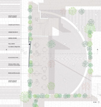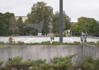 The proposal for the monument to Slovenian independence is conceived simply and with restraint, using two basic elements: a flagpole and a bronze cast of a wall. It is based on a clear spatial arrangement, while its significance is shaped through context, concept, and the event of raising the flag. The use of bronze establishes a connection with the tradition of public memorials, and the slightly curved wall emphasizes the importance of the space.