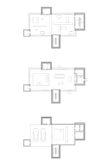 Hiša v Podutiku je jasno členjena na bivalne in servisne prostore. Servisni prostori so umeščeni v štiri betonska jedra, postavljena na obod hiše tako, da podpirajo medetažne plošče z bivalnimi površinami, usmerjajo poglede na vse štiri strani in definirajo zunanje prostore. Dostop do hiše subtilno sledi obstoječi topografiji terena, pritlična medetažna plošča pa deluje kot nadstrešek vhoda s parkiriščem. Interier hiše nastopa kot posledica arhitekture, pri čemer izmaknjena programirana jedra omogočajo zelo fleksibilno in odprto zasnovo bivalnih površin. Zgornje nadstropje je z lesenimi omarami razdeljeno na več posameznih spalnic. V nasprotju z monolitno in racionalno hišo je zunanja ureditev organska in zelo nekontrolirana, s čimer se vzpostavi močan konstrast med naravo in grajenim, ki posledično okrepi kvalitete obojega.