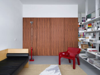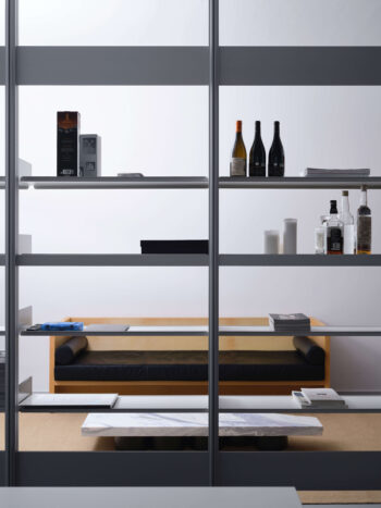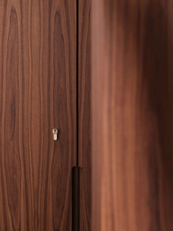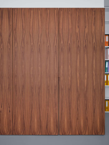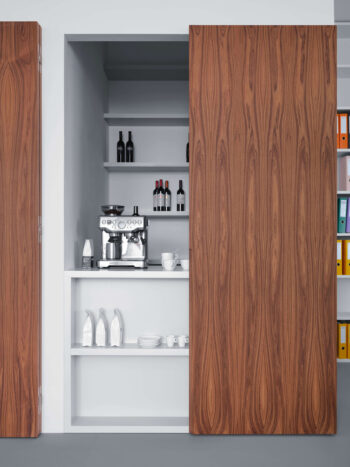 Sprejemnica podjetja Sinhro d.o.o. je opremljena z izbranimi kosi pohištva in štirimi lesenimi paneli, ki služijo kot vhodna vrata in omara s skritim barom.
