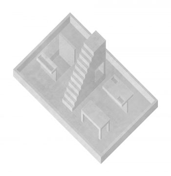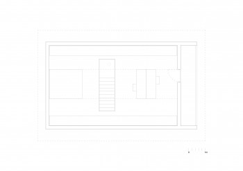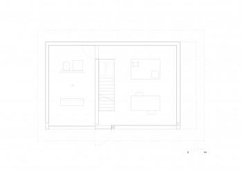 Nizek strop obstoječega skednja narekuje novo betonsko bazo grajeno 45 cm pod obstoječi nivo. Iz betonske baze zrastejo betonski kosi pohištva. Zelo majhna bivalna površina je zelo definirana – determinira en sam način uporabe in načrtno vzpostavi kontrast z nedefinirano naravo v okolici.